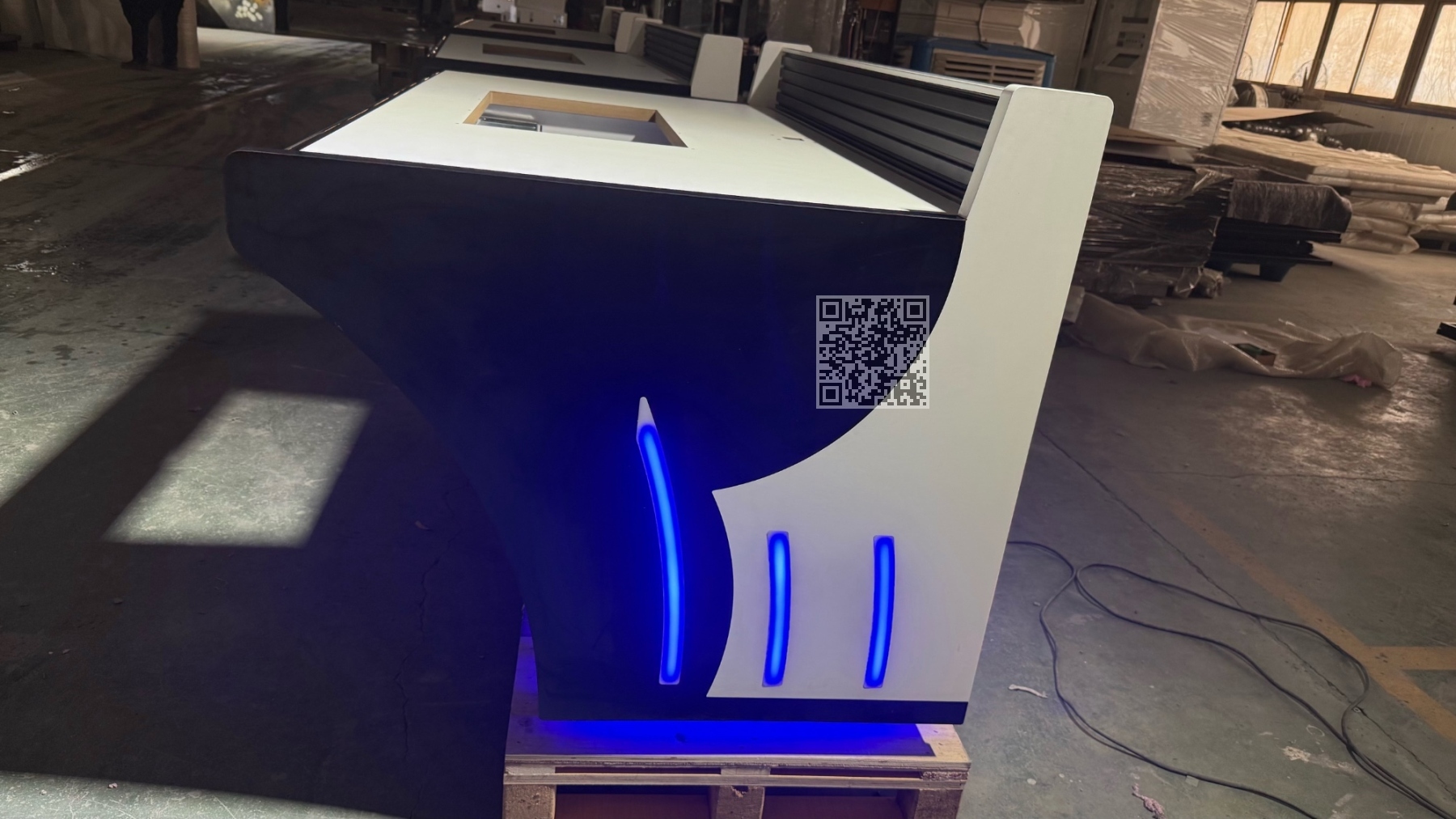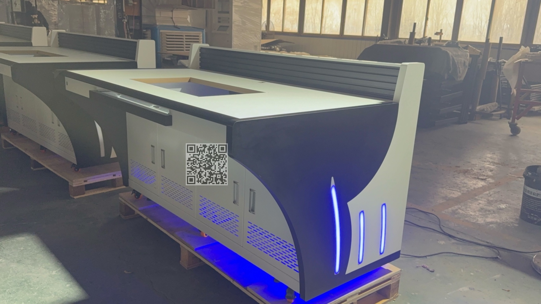 近日,在我司现代化生产基地内,一组造型新颖、功能集成的高端定制操作台整齐排列,正待发运。这批产品采用行业的流线型曲面设计,搭配双色拼色工艺与蓝色LED氛围灯带,兼具美观性与实用性。